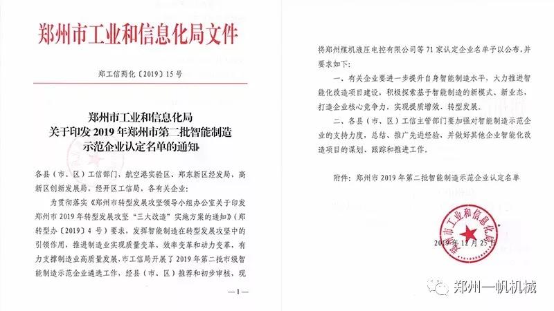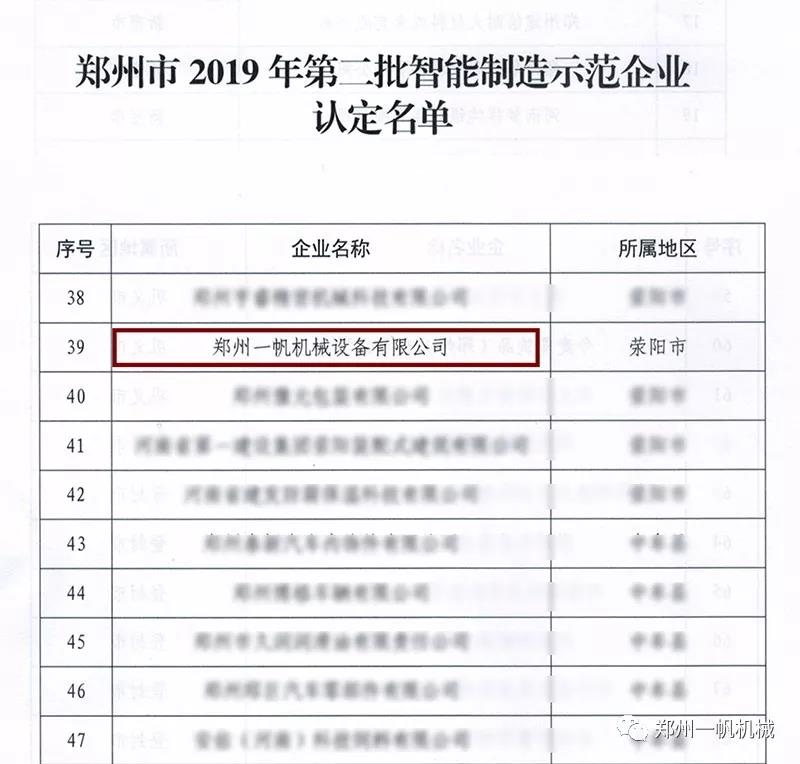 近日,鄭州市工業(yè)和信息化局傳來喜訊,鄭州一帆機(jī)械設(shè)備有限公司入選“2019年鄭州市第二批智能制造示范企業(yè)認(rèn)定”名單,成為鄭州市2019年被認(rèn)定的“智能制造示范企業(yè)”。
